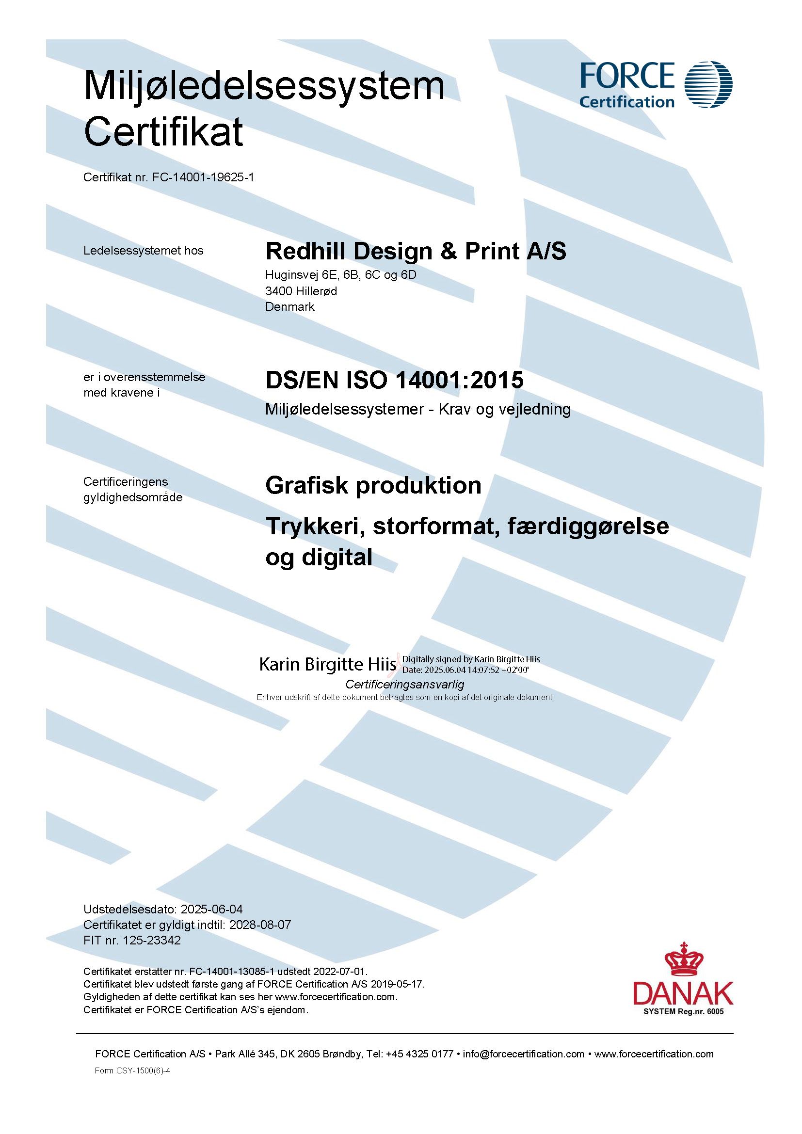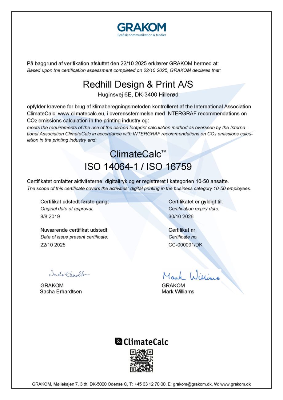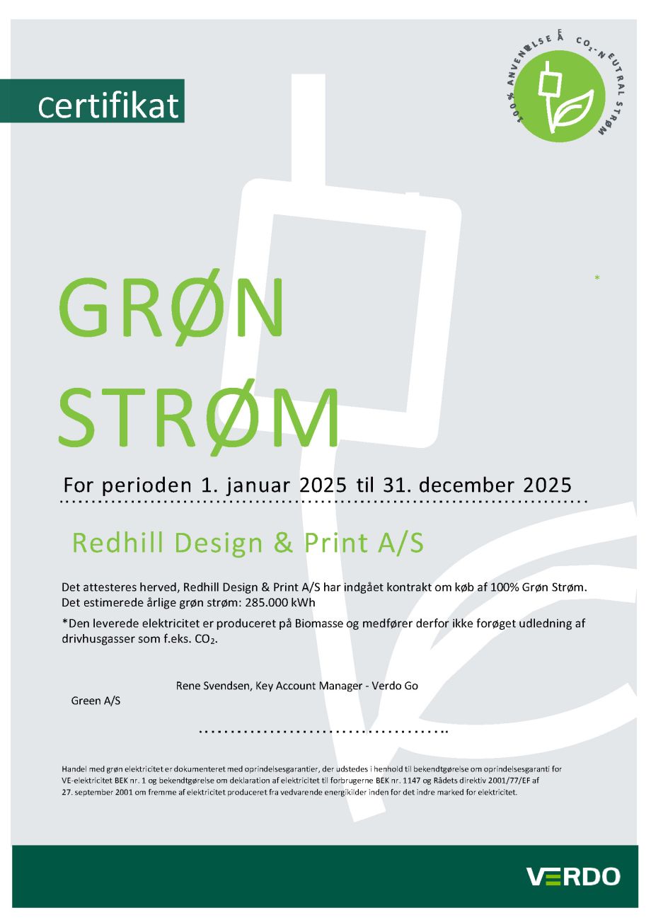 Redhill Design + Print er miljøcertificeret efter DS/EN ISO 14001 – og har været det siden 1998.